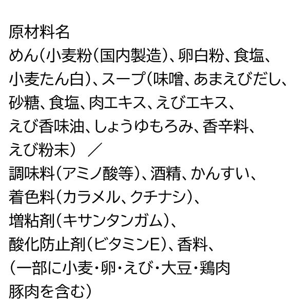 めん(小麦粉(国内製造)、卵白粉、食塩、小麦たん白)、スープ(味噌、あまえびだし、砂糖、食塩、肉エキス、えびエキス、えび香味油、しょうゆもろみ、香辛料、えび粉末) / 調味料(アミノ酸等)、酒精、かんすい、着色料(カラメル、クチナシ)、増粘剤(キサンタンガム)、酸化防止剤(ビタミンE)、香料、(一部に小麦・卵・えび・大豆・鶏肉・豚肉を含む)